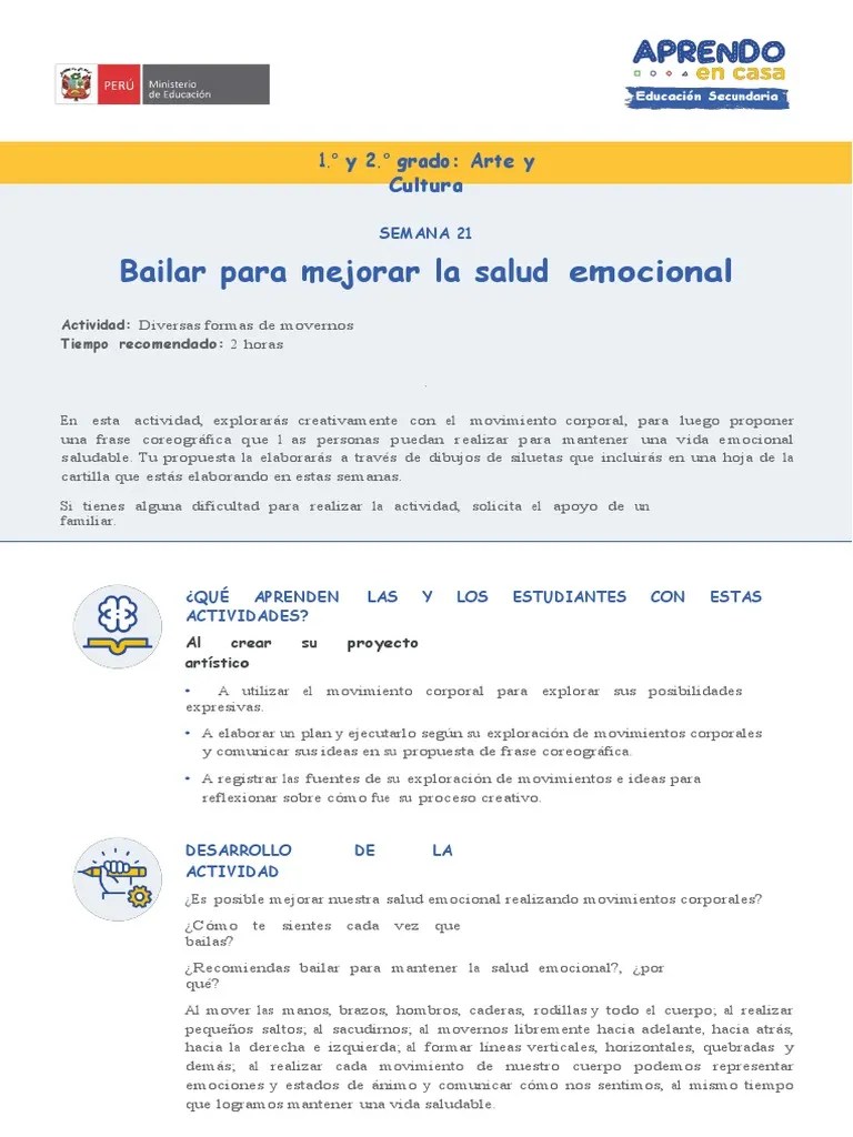 Programación radio y tv semana 30 del 08 al 13 de noviembre de 2021 inicial, primaria y secundaria... 8 c1 / el aporte de las artes y la cultura a una educación de calidad cuando la educación se encuentra con el arte y la cultura, se abre una vía Actividad de trabajo para el nivel primaria View arte y cultura semana n° 21.pdf from bio 12 at santa rosa junior college. Bailar para mejorar la salud emocional ¿qué emociones sientes cada vez que bailas? Cada vez que bailo me siento bien, siento emociones positivas de felicidad, alegría y entusiasmo. Fichas secundaria arte y cultura.